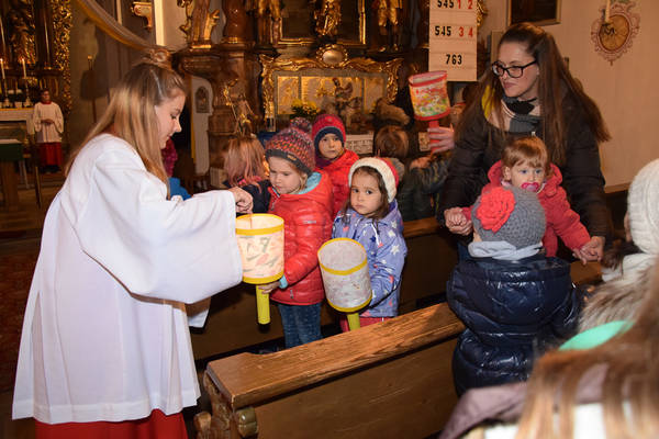 Begleitet wurde diese Martinsfeier mit Liedern auf der Orgel. Auf Großleinwand, von Gerhard Englbrecht projiziert, konnten alle Besucher dieses Spiel auch in den hinteren Bänken verfolgen. Pfarrer Reinhard Röhrner sagte: An diesem Tag ehren wir St. Martin, unsere Pfarrpatron. Denn der heilige Martin war ein besonderer Mensch. Wie der Hl. Martin sollten auch wir auf den Anderen schauen und mit ihm teilen, soweit es möglich ist. Bringen wir das Licht in die Welt und teilen mit unseren Mitmenschen. Pfarrer Reinhard Röhrner segnete danach das Licht und die Laternen. Es war ein schönes Bild, als die Kinder die brennenden Laternen nach oben und vorne hielten. Heuer konnte der Umzug nicht im Freien gehalten werden, wegen der schlechten Witterung. So zogen die Kinder mit den Ministranten und Pfarrer Röhrner durch die Kirche und die Kinder waren fest dabei mit zu singen bei den Liedern "Laterne, Laterne, Sonne, Mond und Sterne" und "Ich geh mit meiner Laterne!". Nach der Segnung der Martinsbrote erhielten alle aus den Händen von den Ministranten und Pfarrer Röhrner, sowie Pfarrvikar Dr. Hilary Muotoe, jeder die beliebten Martinsplätzchen überreicht. (fk)